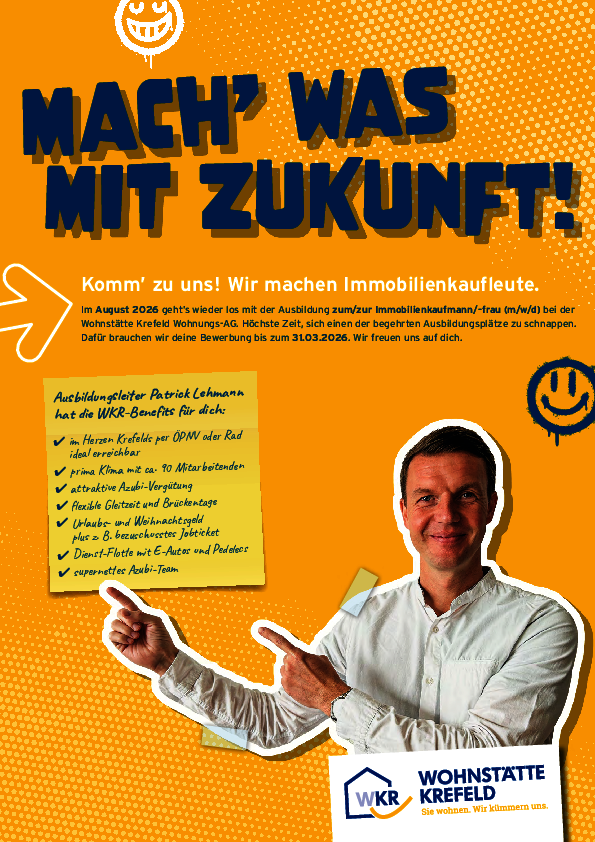 Bei Interesse an der Ausbildung zum/zur Immobilienkaufmann/-kauffrau (m/w/d) wende dich bitte an unseren Ausbildungsleiter, Patrick Lehmann, Tel. 02151 6327-540, oder schicke deine Bewerbung per E-Mail direkt an: bewerbung@wohnstaette-krefeld.de