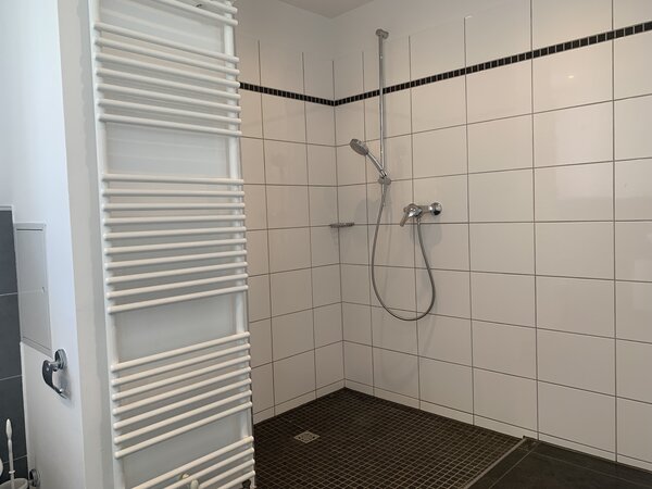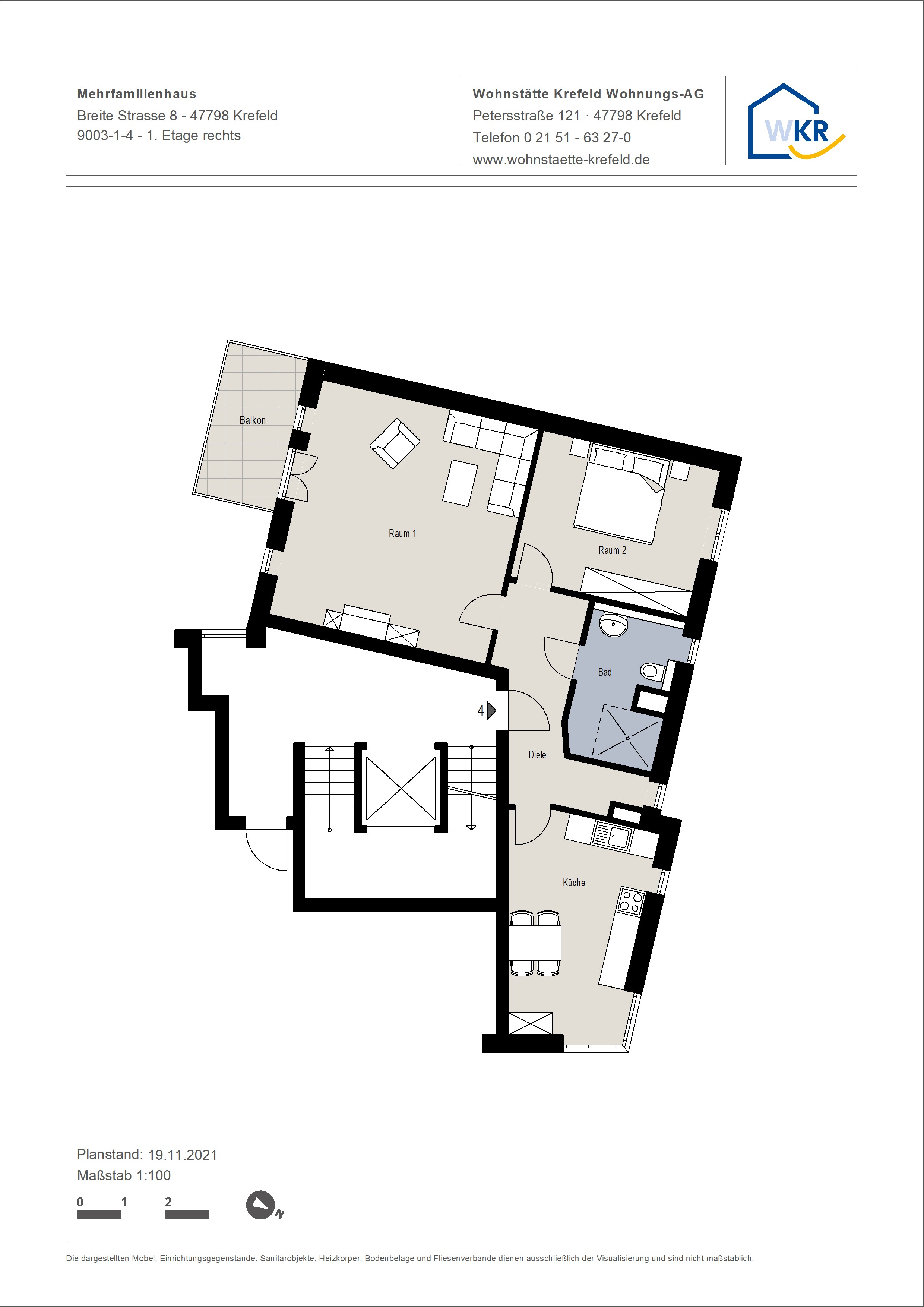 Die Wohnung befindet sich im ersten Obergeschoss eines gepflegten 8-Parteien-Hauses. Alle Wohnungen sind barrierefrei errichtet und über zwei zentrale Treppenhäuser mit behindertengerechten Aufzügen erschlossen. Die in Süd- bzw. Westausrichtung angeordneten Balkone sind ebenfalls barrierefrei erschlossen. Im Kellergeschoss sind in der Tiefgarage 14 Stellplätze angeordnet, wovon zwei als Behindertenstellplätze ausgebildet wurden, die ebenfalls über die zentralen Treppenhäuser mit Aufzug direkt erschlossen wurden. Der Kaufpreis für einen nicht überdachten Stellplatz beträgt 9.000 € und für einen überdachten Stellplatz 9.500 €. Im Kellergeschoss befinden sich Hausanschlussraum, Abstellräume sowie ein zentraler Waschraum mit Anschlüssen für Waschmaschinen und Trockner. Jede Wohnung hat einen eigenen Waschmaschinenanschluss. Die Wohnanlage verfügt über einen begrünten Innenhof. Neben den privaten Terrassenbereichen bietet der Innenhof eine zentrale Sitz- und Ruheplatzzone. Sowohl von den Wohnungen als auch durch die zentralen Treppenhäuser ist der Innenhof barrierefrei zu erreichen.