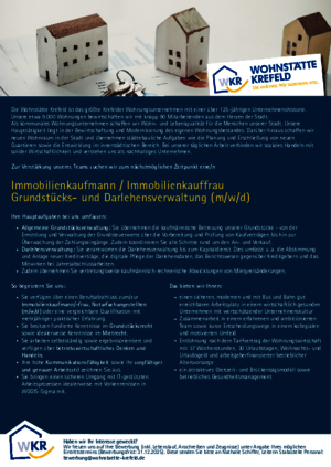 Als der führende Wohnungsanbieter in Krefeld sucht die Wohnstätte Krefeld fortlaufend talentierte Auszubildende, die unser Unternehmen mit ihrem persönlichen Engagement bereichern. Dabei legen wir Wert auf Team- und Kommunikationsfähigkeit sowie Zuverlässigkeit und Verantwortungsbereitschaft. Abitur bzw. Fachabitur oder einen sehr guten Realschulabschluss (Mittlere Reife) setzen wir voraus.